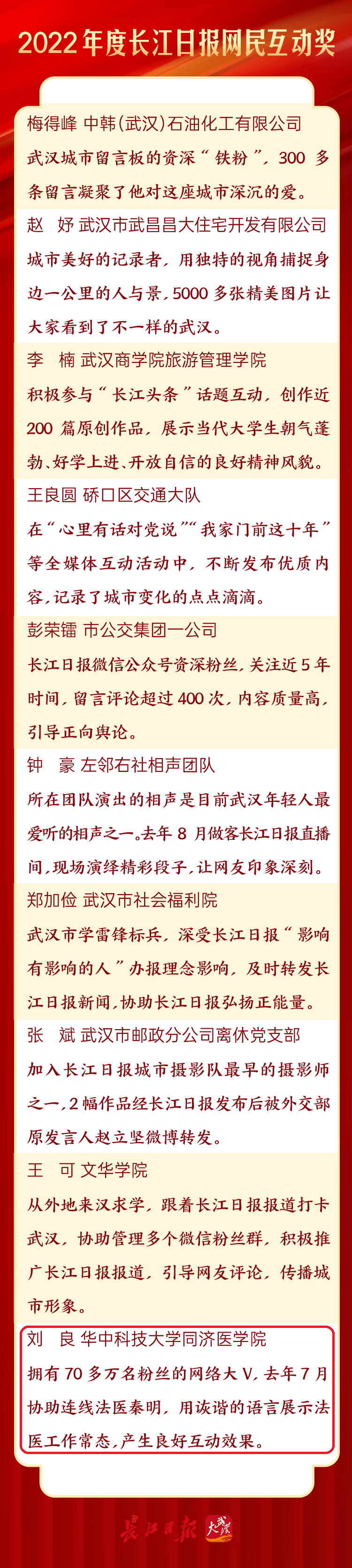 5月22日,在长江日报创刊74周年之际,《2022年度长江日报优秀通讯员》系列奖项揭晓,共33人获奖,其中,10人获优秀通讯员荣誉,13人获新闻贡献奖,10人获网民互动奖。作为一名法医学专家,刘良教授获“网民互动奖”。