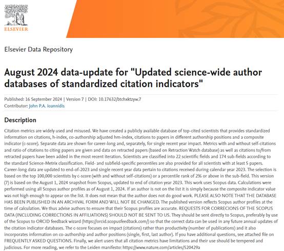 Ioannidis, John P.A. (2024), “August 2024 data-update for "Updated science-wide author databases of standardized citation indicators"”, Elsevier Data Repository, V7, doi: 10.17632/btchxktzyw.7