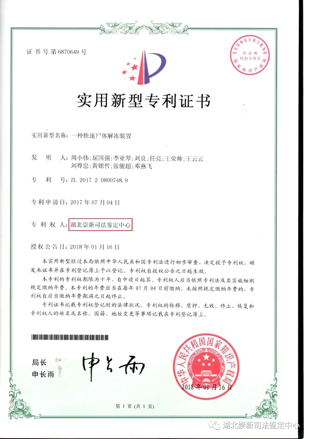 2.由湖北崇新司法鉴定中心的周小伟博士申报的快速尸体解冻方法研究及专利开发课题,已成功申请实用新型专利一项,提供了一套科学的快速尸体解冻方法。