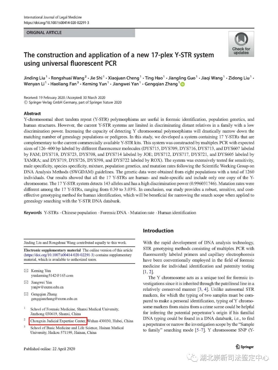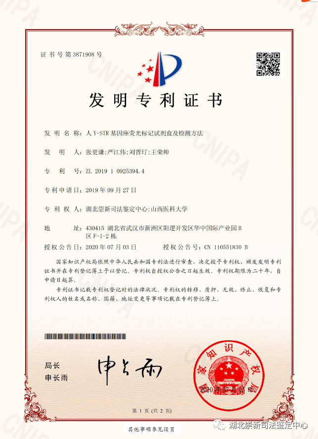 4. 由山西医科大学法医学系张更谦老师申报的《新Y-STR遗传标记复合扩增系统的研发》课题,已在《InternationalJournal of Legal Medicine》杂志上发表论文一篇,并发明“人Y-STR基因座荧光标记试剂盒及检测方法”专利一篇,进一步丰富了法医物证STR检测系统。